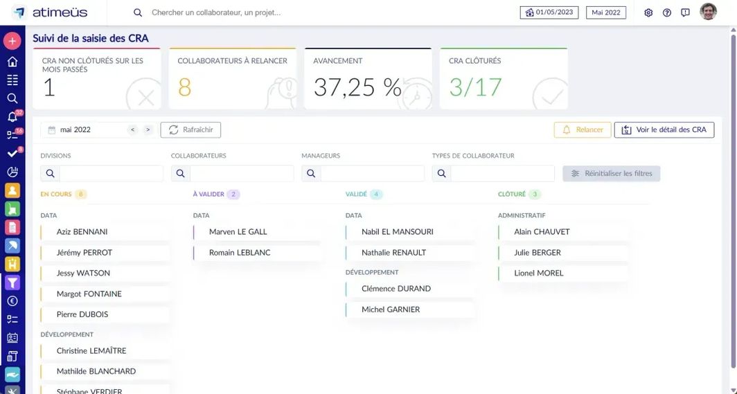 L'ERP atimeüs vous accompagne dans toutes les étapes de la clôture mensuelle, collecte des temps des collaborateurs, valorisation du chiffre d'affaires, contrôle des coûts, facturation, calcul des provisions comptables, production des rapports d'analyse du mois.