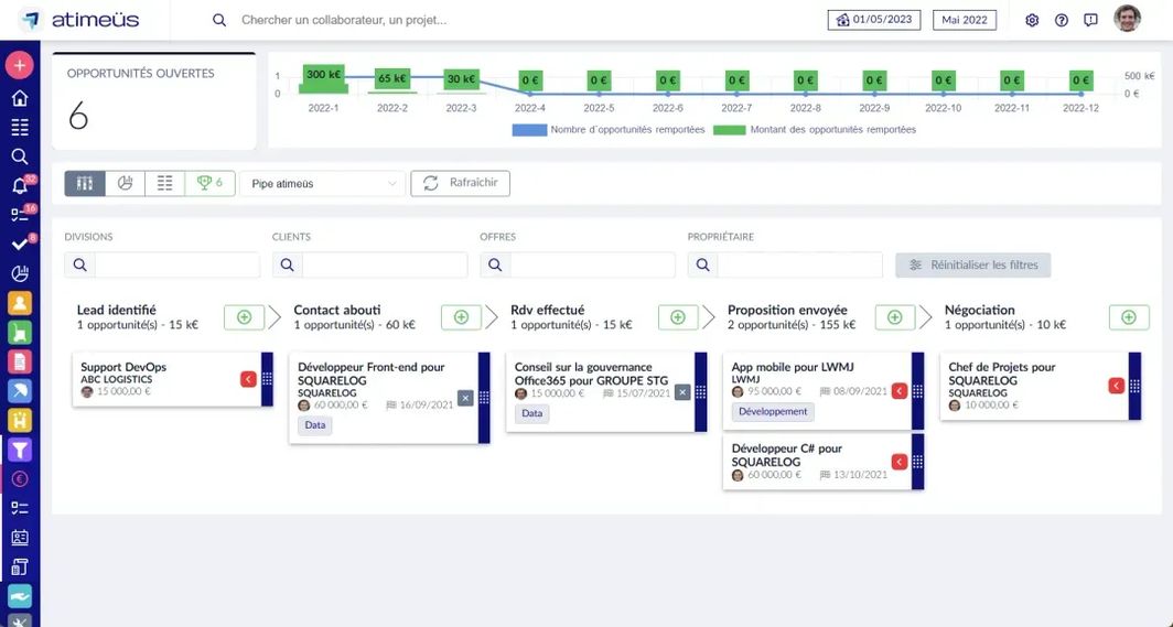 Grâce à atimeüs, identifiez facilement vos leads et qualifiez vos prospects. Vous suivez vos opportunités Client dans un pipeline personnalisé où toutes les actions commerciales sont tracées. L'avant-vente gagne en efficacité.