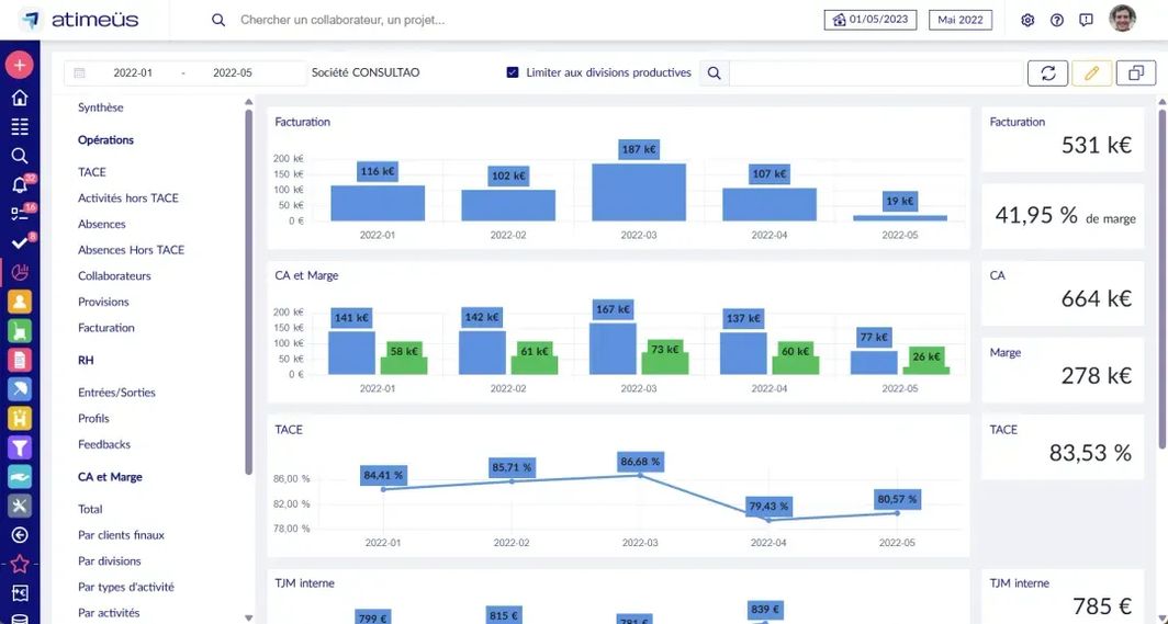 Toute la donnée saisie dans l'ERP atimeüs est accessible et disponible pour répondre aux besoins d'analyse détaillée de l'activité. Tous les indicateurs clés de performance (KPI) spécifiques aux ESN : chiffre d'affaires (CA), taux d'activité congés exclus (TACE), marge sur affaire, taux journalier moyen (TJM), évolution des effectifs (entrées/sorties), etc.