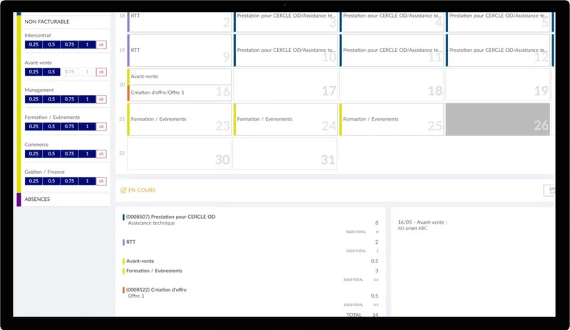 Suivez les sujets en dehors des missions clients - avant-vente, management, formation, support, projets internes.